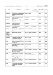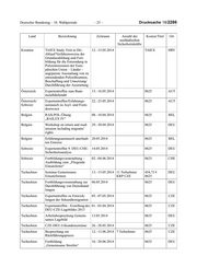 Deutscher Bundestag – 18. Wahlperiode – 25 – Drucksache 18/2286 Land Bezeichnung Zeitraum Anzahl der Kosten/Titel Ort ausländischen Sicherheitskräfte Kroatien TAIEX Study Visit in Dtl.: 12.–15.05.2014 TAIEX HRV Ablauf/Verfahrensweise der Grundausbildung und Fort- bildung für die Entsendung in Polizeimissionen der Euro- päischen Union – Länder – angepasste Ausstattung von zu entsendenden Polizeibeamten, Beschaffung und Umsetzung/ Durchführung der Ausstattung Österreich Expertentreffen zum Bunt- 15.–16.05.2014 0625 AUT metalldiebstahl Österreich/ Expertentreffen/Erfahrungs- 22.–23.05.2014 0625 AUT Schweiz austausch zu Asyl- und Frem- denwesen Belgien RAILPOL-Übung 08.–10.04.2014 0625 BEL „RAILEX IV“ Belgien Workshop on return and read- 29.–30.04.2014 0625 DEU mission including migrantsʼ rights Belgien Erfahrungsaustausch unerlaub- 20.05.2014 0625 BEL ten Einreise Schweiz Expertentreffen 9. DEU-CHE- 14.05.2014 0625 DEU Sicherheitsanalyse Schweiz Fortbildungsveranstaltung – 02.–04.06.2014 0625 CHE Ausbildung zum „Fliegende Einsatzleiter“ Tschechien Seminar Gemeinsame 13.–15.05.2014 11 Teilnehmer 454,73 € DEU Einsatzformen KRP CZE 0625 Tschechien Fortbildungsveranstaltung zur 06.05.2014 0625 DEU Durchführung von Diensthand- lungen Tschechien Expertentreffen zu Entwick- 05.–07.05.2014 0625 CZE lungen der Sekundärmigration Tschechien Expertentreffen – Erstellung des 01.–03.04.2014 0625 CZE DEU-CZE-Lagebildes 2013 Tschechien Arbeitsbesprechung Gemein- 13.05.2014 0625 DEU sames Lagebild Tschechien CZE-DEU-Urkundenseminar 26.–28.05.2014 0625 CZE Tschechien Besprechung zur 12.–13.06.2014 7 Teilnehmer 0625 CZE Rückführungspraxis Tschechien Fortbildung 16.–20.06.2014 0625 DEU „Gemeinsame Streifen“