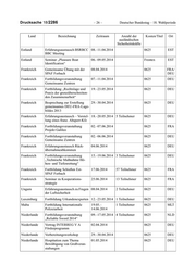 Drucksache 18/2286 – 26 – Deutscher Bundestag – 18. Wahlperiode Land Bezeichnung Zeitraum Anzahl der Kosten/Titel Ort ausländischen Sicherheitskräfte Estland Erfahrungsaustausch BSRBCC 08.–11.04.2014 0625 EST BBC Meeting Estland Seminar „Pleasure Boat 06.–09.05.2014 Frontex EST Identification“ Frankreich Gemeinsame Übung mit der 08.04.2014 0625 FRA/ SPAF Forbach DEU Frankreich Fortbildungsveranstaltung 07.–11.04.2014 0625 DEU Gemeinsame Zentren Frankreich Fortbildung „Rechtslage und 19.–23.05.2014 0625 DEU Praxis der grenzüberschreiten- den Zusammenarbeit“ Frankreich Besprechung zur Erstellung 29.–30.04.2014 0625 DEU gemeinsames DEU-FRA-Lage- bildes 2013 Frankreich Erfahrungsaustausch – Vorstel- 18.–20.05.2014 5 Teilnehmer 0625 DEU lung eines franz. Absperr-Kfz Frankreich Fortbildungsveranstaltung 02.–07.06.2014 0625 FRA Projekt Galileo Frankreich Fortbildungsveranstaltung 02.–06.06.2014 0625 DEU Gemeinsame Zentren Frankreich Erfahrungsaustausch Rück- 04.06.2014 0625 DEU übernahmeabkommen Frankreich Fortbildungsveranstaltung 15.–19.06.2014 3 Teilnehmer 0625 DEU „Technische Maßnahme Hö- hen- und Tiefenrettung“ Frankreich Fortbildung Schießen Est- 17.06.2014 57 Teilnehmer 0625 FRA SPAF Forbach Frankreich Seminar zu Kooperations- 25.06.2014 13 Teilnehmer 0625 FRA strategie Ungarn Erfahrungsaustausch zu Fragen 08.04.2014 2 Teilnehmer 0625 DEU der Luftsicherheit Luxemburg Fortbildung Urkundenexperten 12.–23.05.2014 1 Teilnehmer 0625 DEU Malta Fortbildung Internationale 19.05.– 1 Teilnehmer 0625 MLT Polizeiarbeit 14.06.2014 Niederlande Fortbildungsveranstaltung 09.–17.05.2014 4 Teilnehmer 0625 NLD „Reliable Sword 2014“ Niederlande Vortrag INTERREG V A 02.04.2014 0625 DEU Förderprogramm Niederlande Vorbereitungsworkshop 29.–30.04.2014 0625 DEU Niederlande Hospitation zum Thema 01.05.2014 0625 DEU Bewältigung von Großveran- staltungen