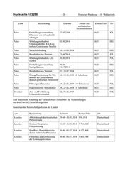 Drucksache 18/2286 – 28 – Deutscher Bundestag – 18. Wahlperiode Land Bezeichnung Zeitraum Anzahl der Kosten/Titel Ort ausländischen Sicherheitskräfte Polen Fortbildungsveranstaltung 27.05.2104 0625 POL Erkennen von Urkundenfäl- schungen Polen Schulungsmaßnahme 02.06.2014 0625 DEU Urkundendelikte, Kfz-Kon- trollen, Gemeinsame Streifen Polen Sprachfortbildung 10.–16.06.2014 0625 DEU Polen Berufsethisches Seminar 23.06.2014 0625 POL Polen Schulungsmaßnahme Kfz- 26.06.2014 0625 POL Delikte Polen Fortbildungsveranstaltung 30.06.– 0625 DEU Multiplikatoren 04.07.2014 Polen Berufsethisches Seminar 07.–13.07.2014 0625 POL Polen Übung Teamtraining für Mit- 16.–18.06.2014 6 Teilnehmer 0625 DEU arbeiter der gemeinsamen deutsch-polnischen Dienststelle Polen Führungskräfteseminar 24.–26.06.2014 14 Teilnehmer 0625 POL Polen Expertentreffen Schießlehrer 24.–25.06.2014 5 Teilnehmer 0625 DEU Slowakei Aus- und Fortbildung 02.–06.06.2014 0625 SVK Urkundenkriminalität Eine statistische Erhebung der Gesamtkosten/Teilnehmer für Veranstaltungen aus dem Titel 0625 wird nicht geführt. Inspekteur der Bereitschaftspolizeien der Länder Land Bezeichnung Zeitraum Kosten/Titel Ort Kroatien Arbeitsbesuch der kroatischen 29.04.–30.05.2014 956,19 € Deutschland Polizeileitung Kroatien Seminar/Hospitation 11.05.–16.05.2014 7 716,06 € Deutschland Präventionstag Kroatien Handbuch Kontaktbereichs- 26.06.–03.07.2014 4 172,46 € Deutschland dienst Technische Prävention Kroatien Förderung und Entwicklung 30.06.–04.07.2014 5 605,78 € Deutschland der Kriminalprävention