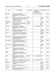 Deutscher Bundestag – 18. Wahlperiode – 33 – Drucksache 18/2286 Land Bezeichnung Zeitraum Anzahl der Kosten/Titel Ort ausländischen Sicherheitskräfte Ägypten Schulungen im Bereich der 50–70 Teilnehmer 0610 CHN Bekämpfung der Urkundenkrimi- nalität Ghana Informationsbesuch von Vertretern 2. HJ 2 2 700 € DEU des Ghana Immigration Service am 0610 Flughafen Frankfurt Hongkong Flughafenpartnerschaft 5 Tage 0610 DEU Israel Erfahrungsaustausch im Bereich 3 Tage 400 € Dienstpferdewesen 0610 Jordanien Schulungen im Bereich der 10–15 Teilnehmer 0610 JOR Bekämpfung der Urkundenkrimi- nalität Kosovo Schulungen im Bereich Urkunden- 2 500 € KOS kriminalität FH Pristina 0610 Kosovo Hospitation eines Grenzkontroll- 1 2 000 € DEU beamten KOS an einem deutschen 0610 FH Montenegro Erfahrungs- und Informationsaus- 3 000 € tausch Flughafen Köln/Bonn und 0610 Flughafen Podgorica Mazedonien Evaluierung Flughafen Skopje 3 000 € MKD zur Feststellung des Ausbildungs- 0610 bedarfs Mazedonien Schulungen im Bereich der 3 000 € MKD Bekämpfung der Urkundenkrimi- 0610 nalität Nigeria Schulungen im Bereich der 0610 NGA Bekämpfung der Urkundenkrimi- nalität Oman Schulungen im Bereich der 0610 OMN Bekämpfung der Urkundenkrimi- nalität Katar Schulungen im Bereich der 4 Tage 10–15 Teilnehmer 0610 QAT Bekämpfung der Urkundenkrimi- nalität Katar Schulungen im Bereich der Grenz- 4 Tage 10–15 Teilnehmer 0610 QAT kontrolle (1. und 2. Kontrolllinie) Serbien Erfahrungs- und Informations- 3 000 € DEU austausch 0610 Serbien Schulungen im Bereich Grenz- 3 000 € SRB polizei 0610 Serbien Schulungen im Bereich polizeili- 2 000 € DEU che Auswertung/Analyse 0610