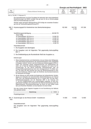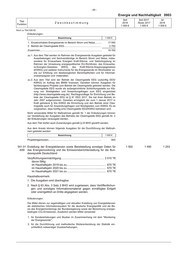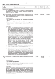 - 49 - Energie und Nachhaltigkeit 0903 Soll Soll 2017 Ist Titel Zweckbestimmung 2018 Reste 2017 2016 Funktion 1 000 € 1 000 € 1 000 € Noch zu Titel 526 02 Erläuterungen: Bezeichnung 1 000 € 1. Einzelvorhaben Energiewende im Bereich Strom und Netze.......... 17 000 2. Betrieb der Clearingstelle EEG....................................................... 2 700 Zusammen............................................................................................ 19 700 zu 1. Aus dem Titel werden im Rahmen der Energiewende Ausgaben geleistet für Ausarbeitungen und Sachverständige im Bereich Strom und Netze, insbe- sondere für Erneuerbare Energien Kraft-Wärme- und Sektorkopplung im Rahmen der Umsetzung energiepolitischer EU-Richtlinien, des Erneuerba- re-Energien-Gesetzes (EEG), des Kraft-Wärme-Kopplungsgesetzes (KWKG) und weiterer Instrumente für die Energiewende im Stromsektor so- wie zur Erfüllung von diesbezüglichen Berichtspflichten und für Informati- onskampagnen und -materialien. zu 2. Aus dem Titel wird der Betrieb der Clearingstelle EEG (zukünftig EEG/ KWKG) im Auftrag des BMWi finanziert. Daneben können Ausgaben für fachbezogene Projekte zum Betrieb der Clearingstelle geleistet werden. Die Clearingstelle EEG wurde als außergerichtliche Schlichtungsstelle zur Klä- rung von Streitigkeiten und Anwendungsfragen zum EEG eingerichtet (http://www.clearingstelle-eeg.de). Rechtsgrundlage für Einrichtung und Be- trieb der Clearingstelle EEG ist § 81 EEG 2017. Sie hat ihren Betrieb im Jahr 2007 aufgenommen. Daneben ermöglicht der zum 1. Januar 2017 in Kraft getretene § 32a KWKG die Einrichtung und den Betrieb einer Clea- ringstelle auch für Anwendungsfragen und Streitigkeiten zum KWKG. Es ist vorgesehen, dass künftig eine Clearingstelle EEG/KWKG betrieben wird. Nicht verwendete Mittel für Maßnahmen gemäß Nr. 1 der Erläuterungen können zur Verstärkung der Ausgaben des Betriebs der Clearingstelle EEG gemäß Nr. 2 der Erläuterungen verausgabt werden. Aus dem Titel dürfen auch Zuwendungen gemäß § 23 BHO gezahlt werden. Aus dem Ansatz können folgende Ausgaben für die Durchführung der Maßnah- men geleistet werden: Bezeichnung 1 000 € Projektträgerkosten............................................................................... 945 541 01 Erstellung der Energiebilanzen sowie Bereitstellung sonstiger Daten für 1 502 1 495 1 253 -649 das Energiemonitoring und die Emissionsberichterstattung für die Bun- desrepublik Deutschland Verpflichtungsermächtigung......................................................... 2 010 T€ davon fällig: im Haushaltsjahr 2019 bis zu.................................................... 670 T€ im Haushaltsjahr 2020 bis zu.................................................... 670 T€ im Haushaltsjahr 2021 bis zu.................................................... 670 T€ Haushaltsvermerk: 1. Die Ausgaben sind übertragbar. 2. Nach § 63 Abs. 3 Satz 2 BHO wird zugelassen, dass Veröffentlichun- gen und sonstiges Informationsmaterial gegen ermäßigtes Entgelt oder unentgeltlich an Dritte abgegeben werden. Erläuterungen: Die Mittel dienen zur regelmäßigen und aktuellen Erstellung von Energiebilanzen als statistisches Informationssystem für die deutsche Energiepolitik und als Ba- sis des Energiemonitorings der Bundesregierung sowie der Berechnung energie- bedingter CO2-Emissionen. Zusätzlich werden Mittel verwendet: 1. für Sondererhebungen und Studien im Zusammenhang mit dem "Monitoring der Energiewende", 2. für die Durchführung und methodische Weiterentwicklung der Statistik ein- schließlich notwendiger Zusatzerhebungen,