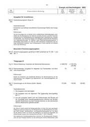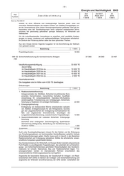 - 52 - 0903 Energie und Nachhaltigkeit Soll Soll 2017 Ist Titel Zweckbestimmung 2018 Reste 2017 2016 Funktion 1 000 € 1 000 € 1 000 € Noch zu Titel 686 02 Vergabe durch Einzelaufträge rd. 50 Prozent der zur Verfügung stehenden Mittel für Aufträge an die GRS vorgesehen. Aus dem Ansatz können folgende Ausgaben für die Durchführung der Maßnah- men geleistet werden: Bezeichnung 1 000 € Projektträgerkosten............................................................................... 1 550 686 03 Steigerung der Energieeffizienz 40 988 40 988 23 969 -649 20 357 Verpflichtungsermächtigung....................................................... 21 700 T€ davon fällig: im Haushaltsjahr 2019 bis zu............................................... 18 700 T€ im Haushaltsjahr 2020 bis zu................................................. 2 000 T€ im Haushaltsjahr 2021 bis zu................................................. 1 000 T€ Haushaltsvermerk: 1. Die Ausgaben sind übertragbar. 2. Einsparungen zu Nr. 5 der Erläuterungen dienen zur Deckung von Mehrausgaben bei folgendem Titel: Kap. 3208 Tit. 871 01. 3. Einnahmen zu Nr. 3 der Erläuterungen aus Rückforderungen ausge- zahlter Zuwendungen wegen teilweisen Widerrufs von Zuwendungs- bescheiden fließen den Ausgaben zu. 4. Nach § 63 Abs. 3 Satz 2 BHO wird zugelassen, dass Veröffentlichun- gen und sonstiges Informationsmaterial gegen ermäßigtes Entgelt oder unentgeltlich an Dritte abgegeben werden. Erläuterungen: Bezeichnung 1 000 € Folgende Themenbereiche werden in Form von Zuschüssen geför- dert: 1. Energieberatung Mittelstand - Unabhängige Energieberatung für kleine und mittlere Unternehmen (KMU)......................................... 11 838 2. Unabhängige Beratung privater Verbraucher (auch KMU, sofern Eigentümer von Wohngebäuden) über Möglichkeiten der Energie- einsparung im Haushalt und am Gebäude...................................... 12 000 3. Zuwendungen an die Deutsche Energie-Agentur GmbH (dena)..... 150 4. Studien der Bundesstelle für Energieeffizienz (BfEE) im Rahmen des Gesetzes über Energiedienstleistungen und andere Energie- effizienzmaßnahmen (EDL-G) sowie der Umsetzung der EU- Energieeffizienzrichtlinie (2012/27/EU)........................................... 2 000 5. Vorsorge zur Deckung von Ausfallbürgschaften, die für Investiti- onskredite und/oder Vertragserfüllungsavale bei der Durchfüh- rung von Energieeinsparcontracting begeben werden bei Kap. 3208 Tit. 871 01...................................................................... 15 000 Zusammen............................................................................................ 40 988 Zu 1.: Gefördert wird eine unabhängige Energieberatung von KMU, bei der vom Berater die Einsparpotenziale ermittelt werden. Mit diesem Programm werden hochwerti- ge Energieaudits im Sinne von Art. 8 Abs. 1 der Richtlinie 2012/27/EU des Euro- päischen Parlaments und des Rates vom 25. Oktober 2012 zur Energieeffizienz (EED) gefördert. Das Programm dient damit auch der Umsetzung von Art. 8 Abs. 1 EED. Zu 2.: Gefördert wird insbesondere eine unabhängige und individuelle Beratung und In- formation privater Verbraucherinnen und Verbraucher sowie von KMU über die Möglichkeiten der Energieeinsparung, einschließlich der Nutzung erneuerbarer Energien. Ein Schwerpunkt wird dabei auf der Beratung der energetischen Sanie- rung im Gebäudebestand liegen. Mit diesem Programm werden hochwertige