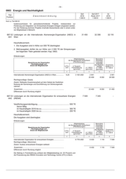 - 54 - 0903 Energie und Nachhaltigkeit Soll Soll 2017 Ist Titel Zweckbestimmung 2018 Reste 2017 2016 Funktion 1 000 € 1 000 € 1 000 € Noch zu Titel 686 05 kostenzuschüssen für grenzüberschreitende Projekte, insbesondere zur Förderung und Integration von Erneuerbare-Energien-Anlagen eingesetzt werden. Für die Förderung kommen Projekte innerhalb Deutschlands oder in einem ande- ren Mitgliedstaat in Betracht. 687 02 Leistungen an die Internationale Atomenergie-Organisation (IAEO) in 31 450 32 356 32 116 -641 Wien Haushaltsvermerk: 1. Die Ausgaben sind in Höhe von 500 T€ übertragbar. 2. Mehrausgaben dürfen bis zur Höhe von 2 000 T€ der Einsparungen bei folgenden Titeln geleistet werden: Kap. 0903. Erläuterungen: Mitgliedsbeitrag Besondere der Bundesrepublik Deutschland (freiwillige) Bezeichnung der Organisation (Pflichtleistungen) Leistungen Rechtsgrundlage und außerhalb des Mitglieds- Zusammen Zweck der Mitgliedschaft in Pro- in Tausend- beitrags Spalte 4 + 5 zent Fremdwährung in 1 000 € in 1 000 € in 1 000 € (gerundet) (gerundet) (gerundet) 1 2 3 4 5 6 Internationale Atomenergie-Organisation (IAEO) in Wien................ 6,25 3 100 USD 2 941 - 2 941 20 459 8 050 28 509 Rechtsgrundlage: Gesetz Zweck: Weltweite Zusammenarbeit auf dem Gebiet der friedlichen Nutzung der Kernenergie und Durchführung von Sicherungsmaß- nahmen Zusammen........................................................................................ 23 400 8 050 31 450 Differenzen durch Rundung möglich 687 03 Leistungen an die internationale Organisation für erneuerbare Energien 7 549 7 345 - -642 (IRENA) Verpflichtungsermächtigung............................................................ 500 T€ davon fällig: im Haushaltsjahr 2019 bis zu.................................................... 300 T€ im Haushaltsjahr 2020 bis zu.................................................... 200 T€ Haushaltsvermerk: Die Ausgaben sind übertragbar. Erläuterungen: Mitgliedsbeitrag Besondere der Bundesrepublik Deutschland (freiwillige) (Pflichtleistungen) Leistungen Bezeichnung der Organisation außerhalb Rechtsgrundlage und Zweck der Mitgliedschaft des Mitglieds- Zusammen in Pro- in Tausend- beitrags Spalte 4 + 5 zent Fremdwährung in 1 000 € in 1 000 € in 1 000 € (gerundet) (gerundet) (gerundet) 1 2 3 4 5 6 Internationale Organisation für erneuerbare Energien...................... 6 778 USD 6 430 1 119 7 549 Rechtsgrundlage: Abkommen Zweck: Ausbau erneuerbarer Energien weltweit Zusammen........................................................................................ 6 430 1 119 7 549 Differenzen durch Rundung möglich Der Beitrag in Fremdwährung umfasst den Mitlgliedsbeitrag (rd. 25 Prozent) und die Finanzierung des IRENA Innovation and Technology Centre (IITC) in Bonn.