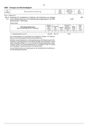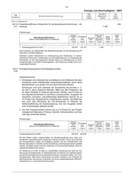 - 59 - Energie und Nachhaltigkeit 0903 Soll Soll 2017 Ist Titel Zweckbestimmung 2018 Reste 2017 2016 Funktion 1 000 € 1 000 € 1 000 € Noch zu Titelgruppe 02 661 23 Investitionsoffensive Infrastruktur für strukturschwache Kommunen - Ab- - - 404 -411 wicklung 1 346 Erläuterungen: Gesamt- Nach 2017 Vorbe- ausgaben Verausgabt übertra- Veran- halten Mehrjährige Maßnahmen des bis Bewilligt gene Aus- schlagt für (davon neue Maßnahmen in Fettdruck) Bundes 2016 2017 gabereste 2018 2019 ff 1 000 € 1 000 € 1 000 € 1 000 € 1 000 € 1 000 € 1 2 3 4 5 6 7 1. Förderprogramme bis 2010..................................................... 104 461 103 115 - 1 346 - - Das Programm war Bestandteil des Maßnahmenpakets der Bundesregierung für Wachstum und Beschäftigung. Gefördert wurden Maßnahmen zur Verbesserung der Infrastruktur in struktur- schwachen Kommunen, insbesondere zur Energieeinsparung, zur Anpassung der Infrastruktur an den demografischen Wandel sowie zur Unterstützung von Exis- tenzgründungen in sozialen Problemgebieten. Die Förderung erfolgte durch zins- vergünstigte Darlehen. 720 21 Energieeinsparprogramm Bundesliegenschaften - - 153 -016 Haushaltsvermerk: 1. Einbezogen sind Gebäude der unmittelbaren und mittelbaren Bundes- verwaltung sowie institutionelle Zuwendungsempfänger, wenn deren Betriebskosten zum großen Teil vom Bund finanziert werden. Einbezogen sind auch Gebäude der Sozialwerke des Bundes e. V., die sich in deren Eigentum befinden. Mittel aus dem Programm, die für diese Gebäude in Anspruch genommen werden, sind im Falle ei- nes Eigentümerwechsels an den Bund zurückzuzahlen. Ausgaben für besonders innovative, zukunftsträchtige Maßnahmen können bis zu 15 Prozent der Gesamtsumme vorgenommen werden. Die Mittel die- nen auch dem Monitoring der CO2-Emissionen im Rahmen der Selbstverpflichtung der Bundesregierung. Aus den Ausgaben dürfen auch Zuwendungen geleistet werden. 2. Von den Programmmitteln können bis zu 0,5 Prozent für das Projekt- management (Beratung, Prüfung, Kontrolle, Dokumentation und Eva- luierung) verwendet werden. Erläuterungen: Gesamt- Nach 2017 Vorbe- ausgaben Verausgabt übertra- Veran- halten Mehrjährige Maßnahmen des bis Bewilligt gene Aus- schlagt für (davon neue Maßnahmen in Fettdruck) Bundes 2016 2017 gabereste 2018 2019 ff 1 000 € 1 000 € 1 000 € 1 000 € 1 000 € 1 000 € 1 2 3 4 5 6 7 Förderprogramme bis 2009........................................................... 439 678 439 678 - - - - Mit den Mitteln sollten Liegenschaften der Bundesverwaltung auch unter wirt- schaftlichen Gesichtspunkten energetisch optimiert werden. Durch die Erhöhung der Energieeffizienz sollten die Ausgaben gesenkt und die Vorbildfunktion des Bundes besonders im Hinblick auf die Ausstellung von Energieausweisen gestärkt werden. Die Mittel sollten auch der Initiierung von Contracting-Projekten sowie für begleitende Maßnahmen dienen. Ein Betrag bis zu 6 Mio. € sollte zur modellhaften Umsetzung des Ziels der Hal- bierung des Energiebedarfs im Gebäudebereich im Rahmen der Hightech-Strate- gie der Bundesregierung bei bundeseigenen Bauten verwandt werden. Der Tech- nologietransfer sollte durch Anwendung innovativer Verfahren und Produkte bei Baumaßnahmen des Bundes unterstützt und durch projektbegleitende Öffentlich- keitsarbeit im In- und Ausland forciert werden.