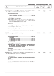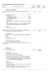 - 72 - 1005 Nachhaltigkeit, Forschung und Innovation Soll Soll 2017 Ist Titel Zweckbestimmung 2018 Reste 2017 2016 Funktion 1 000 € 1 000 € 1 000 € Ausgaben für Investitionen 893 01 Zuschüsse zur Förderung von Modell- und Demonstrationsvorhaben 500 500 - -523 Verpflichtungsermächtigung............................................................ 300 T€ davon fällig: im Haushaltsjahr 2019 bis zu.................................................... 100 T€ im Haushaltsjahr 2020 bis zu.................................................... 100 T€ im Haushaltsjahr 2021 bis zu.................................................... 100 T€ Haushaltsvermerk: 1. Die Ausgaben sind mit folgendem Titel gegenseitig deckungsfähig: 686 01. 2. Die Verpflichtungsermächtigung ist mit der Verpflichtungsermäch- tigung bei folgendem Titel gegenseitig deckungsfähig: 686 01. Erläuterungen: Siehe Erläuterungen zu Tit. 686 01. 893 02 Zuschüsse zur Förderung von Maßnahmen für eine Verbesserung der 21 000 21 000 1 467 -523 Energieeffizienz in Landwirtschaft und Gartenbau 11 533 Haushaltsvermerk: Die Ausgaben sind mit folgendem Titel gegenseitig deckungsfähig: 686 06. Erläuterungen: Siehe Erläuterungen zu Tit. 686 06. Besondere Finanzierungsausgaben 981 03 Verrechnungsausgaben gemäß § 61 BHO außerhalb der Tit. 981 .1 und - - (-) -890 981 .7 Titelgruppe 01 Tgr. 01 Nachwachsende Rohstoffe (61 000) (61 000) (12 510) Haushaltsvermerk: 1. Die Ausgaben sind übertragbar. 2. Die Ausgaben sind gegenseitig deckungsfähig. 3. Die Verpflichtungsermächtigungen sind gegenseitig deckungsfähig. 4. Nach § 63 Abs. 3 Satz 2 BHO wird zugelassen, dass Veröffentlichun- gen und sonstiges Informationsmaterial gegen ermäßigtes Entgelt oder unentgeltlich an Dritte abgegeben werden. Erläuterungen: Gefördert werden sollen 1. der Aufbau von Produktlinien von der Erzeugung bis zur Verwendung nach- wachsender Rohstoffe, 2. Forschungs-, Entwicklungs- und Demonstrationsvorhaben zur Erschließung weiterer Verwendungsmöglichkeiten im Nichtnahrungsmittelsektor,
