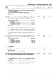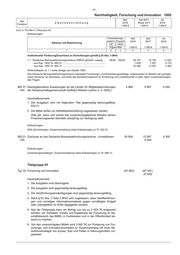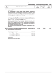 - 75 - Nachhaltigkeit, Forschung und Innovation 1005 Soll Soll 2017 Ist Titel Zweckbestimmung 2018 Reste 2017 2016 Funktion 1 000 € 1 000 € 1 000 € Noch zu Titel 686 21 (Titelgruppe 02) Erläuterungen: Finanzierungs- Soll Soll Ist anteil in Prozent 2018 2017 2016 Adresse und Bezeichnung mit ohne Eigenmittel 1 000 € 1 000 € 1 000 € 1 2 3 4 5 6 Institutionelle Förderung/Zuschüsse an Einrichtungen gemäß § 26 Abs. 3 BHO 1.1 Deutsches Biomasseforschungszentrum (DBFZ) gGmbH, Leipzig.... 99,85 100,00 28 147 19 128 11 023 - aus Kap. 1005 Tit. 686 21................................................................. 7 638 7 061 6 723 - aus Kap. 1005 Tit. 893 21................................................................. 20 509 12 067 4 300 Wirtschaftsplan zu 1.1 siehe Anlage zum Kapitel 1005. Das Deutsche Biomasseforschungszentrum bearbeitet Forschungs- und Entwicklungsaufträge, insbesondere im Bereich der energeti- schen Nutzung von Biomasse, und berät das Bundesministerium für Ernährung und Landwirtschaft in allen damit zusammenhängen- den Fragen. 882 21 Zweckgebundene Zuweisungen an die Länder für Mitgliedseinrichtungen 4 969 5 867 4 545 -164 der Wissenschaftsgemeinschaft Gottfried Wilhelm Leibniz e. V. (WGL) Haushaltsvermerk: 1. Die Ausgaben sind mit folgendem Titel gegenseitig deckungsfähig: 632 21. 2. Die Mittel dürfen zur Selbstbewirtschaftung zugewiesen werden. Dies gilt, wenn und soweit das zuwendungsgebende Sitzland seinen Finanzierungsanteil ebenfalls überjährig zur Verfügung stellt. Erläuterungen: WGL-Einrichtungen: Zusammenstellung siehe Erläuterungen zu Tit. 632 21. 893 21 Zuschuss an das Deutsche Biomasseforschungszentrum - Investitionen - 20 509 12 067 4 300 -165 8 000 Erläuterungen: Zuwendungsempfänger: Zusammenstellung siehe Erläuterungen zu Tit. 686 21. Titelgruppe 03 Tgr. 03 Forschung und Innovation (67 862) (67 651) (6 200) Haushaltsvermerk: 1. Die Ausgaben sind übertragbar. 2. Die Ausgaben sind gegenseitig deckungsfähig. 3. Die Verpflichtungsermächtigungen sind gegenseitig deckungsfähig. 4. Nach § 63 Abs. 3 Satz 2 BHO wird zugelassen, dass Veröffentlichun- gen und sonstiges Informationsmaterial gegen ermäßigtes Entgelt oder unentgeltlich an Dritte abgegeben werden. 5. Aus der Titelgruppe kann ein Betrag von bis zu 2 000 T€ eingesetzt werden, um Vorhaben, Inhalte und Ergebnisse der Forschung im Ge- schäftsbereich des BMEL in Fachkreisen und in der Öffentlichkeit be- kannt zu machen. 6. Von den veranschlagten Mitteln sind 3 000 T€ zur Förderung von For- schungs- und Innovationsvorhaben im Zusammenhang mit einer Re- duktionsstrategie von Zucker, Salz und Fetten in Nahrungsmitteln vor- gesehen.