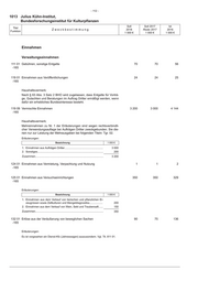 - 112 - 1013 Julius Kühn-Institut, Bundesforschungsinstitut für Kulturpflanzen Soll Soll 2017 Ist Titel Zweckbestimmung 2018 Reste 2017 2016 Funktion 1 000 € 1 000 € 1 000 € Einnahmen Verwaltungseinnahmen 111 01 Gebühren, sonstige Entgelte 70 70 56 -165 119 01 Einnahmen aus Veröffentlichungen 24 24 25 -165 Haushaltsvermerk: Nach § 63 Abs. 3 Satz 2 BHO wird zugelassen, dass Entgelte für Vorträ- ge, Gutachten und Beratungen im Auftrag Dritter ermäßigt werden, wenn dafür ein erhebliches Bundesinteresse besteht. 119 09 Vermischte Einnahmen 3 200 3 000 4 144 -165 Haushaltsvermerk: Mehreinnahmen zu Nr. 1 der Erläuterungen sind wegen rechtsverbindli- cher Verwendungsauflage bei Aufträgen Dritter zweckgebunden. Sie die- nen nur zur Leistung der Mehrausgaben bei folgenden Titeln: Tgr. 02. Erläuterungen: Bezeichnung 1 000 € 1. Einnahmen aus Aufträgen Dritter.................................................... 3 000 2. Sonstiges......................................................................................... 200 Zusammen............................................................................................ 3 200 124 01 Einnahmen aus Vermietung, Verpachtung und Nutzung 1 1 2 -165 125 01 Einnahmen aus Versuchseinrichtungen 350 350 329 -165 Erläuterungen: Bezeichnung 1 000 € 1. Einnahmen aus dem Verkauf von tierischen und pflanzlichen Er- zeugnissen sowie Zellkulturen und Mangeldiagnostika.................. 200 2. Einnahmen aus dem Verkauf von Wein, Sekt und Traubensaft...... 150 Zusammen............................................................................................ 350 132 01 Erlöse aus der Veräußerung von beweglichen Sachen 90 75 136 -165 Erläuterungen: Es ist vorgesehen ein Dienst-Kfz (Jahreswagen) auszusondern. Vgl. Tit. 811 01.