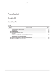 - 103 - Personalhaushalt Einzelplan 05 Auswärtiges Amt Inhalt Kapitel Bezeichnung Seite Vorbemerkungen zum Personalhaushalt.............................................................................................................. 104 Gesamtübersicht................................................................................................................................................... 105 0512 Bundesministerium................................................................................................................................................ 106 0513 Deutsches Archäologisches Institut...................................................................................................................... 116 Übersichten Darstellung der den Planstellen zugeordneten Amtsbezeichnungen.................................................................... 118 Stellenübersichten der Zuwendungsempfänger: 0502 Bilaterale Zusammenarbeit und Pflege der Auslandsbeziehungen...................................................................... 120 0504 Pflege kultureller Beziehungen zum Ausland........................................................................................................ 122