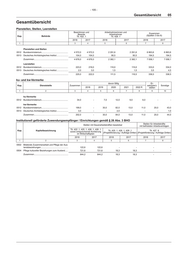 - 105 - Gesamtübersicht 05 Gesamtübersicht Planstellen, Stellen, Leerstellen Beamtinnen und Arbeitnehmerinnen und Zusammen Beamte Arbeitnehmer (Spalten 3 bis 6) Kap. Behörde Tit. 422 .1 Tit. 428 .1 2018 2017 2018 2017 2018 2017 1 2 3 4 5 6 7 8 Planstellen und Stellen 0512 Bundesministerium............................................. 4 572,0 4 572,0 2 291,6 2 291,6 6 863,6 6 863,6 0513 Deutsches Archäologisches Institut.................... 104,0 104,0 90,5 90,5 194,5 194,5 Zusammen.......................................................... 4 676,0 4 676,0 2 382,1 2 382,1 7 058,1 7 058,1 Leerstellen 0512 Bundesministerium............................................. 223,0 219,0 110,0 115,0 333,0 334,0 0513 Deutsches Archäologisches Institut.................... 2,0 3,0 1,5 1,5 3,5 4,5 Zusammen.......................................................... 225,0 222,0 111,5 116,5 336,5 338,5 ku- und kw-Vermerke davon fällig Er- Kap. Dienststelle Zusammen satz(plan)- Sonstige 2018 2019 2020 2021 2022 ff. stellen 1 2 3 4 5 6 7 8 9 10 ku-Vermerke 0512 Bundesministerium............................................. 34,0 - 7,0 12,0 9,0 6,0 - - kw-Vermerke 0512 Bundesministerium............................................. 199,0 - 30,0 82,0 13,0 11,0 20,0 43,0 0513 Deutsches Archäologisches Institut.................... 3,0 - - 2,0 - - - 1,0 Zusammen.......................................................... 202,0 - 30,0 84,0 13,0 11,0 20,0 44,0 Institutionell geförderte Zuwendungsempfänger / Einrichtungen gemäß § 26 Abs. 3 BHO Stellen mit Dauerarbeitskräften besetzbar Stellen für Arbeitskräfte mit befristeten Arbeitsverträgen Kap. Kapitelbezeichnung Tit. 422 .1, 425 .1, 426 .1, 428 .1 Tit. 425 .1, 426 .1, 428 .1 Tit. 427 .9 sowie entsprechende Kontierung im Wirtschaftsplan (Projektförderung / Aufträge Dritter) (Projektförderung / Aufträge Dritter) 2018 2017 2018 2017 2018 2017 1 2 3 4 5 6 7 8 0502 Bilaterale Zusammenarbeit und Pflege der Aus- landsbeziehungen............................................... 122,6 122,6 - - - - 0504 Pflege kultureller Beziehungen zum Ausland..... 721,6 721,6 18,3 18,3 - - Zusammen.......................................................... 844,2 844,2 18,3 18,3 - -