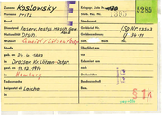 :." > . \ KosLow.sky_ J. Zuname Vorname Erifz Kriegsgr. Liste Nr.~ I Beruf Dienstgrad Res:e~~ Pes.~. Mti_s_ch Nationalität D fS. eh. · ?.J-- (iew. Abt 2 Standesamt l.sg.Nr t.3S!I:.3 I Grobbrief Nr. Grabbezeichnung - C, u e,:r/ / J. ;l? ~tt /o-:I'.J Wohnort ' 80J ~ l_u J Sterb. Reg. Nr. J Sekt. - f: Block I Straße Oberführt am geb. am von in Elf. 4- . -18.8.2 Drossen /(r. Lo'tzen -Ostpr gest. am 11 . 1~ , nach in Denkzeichen p beigesetzt als Leiche_ in ~ ~ ~ ~ - . . -=-=-= {1~~. Bem. I --:;--;::::; 0 .Bundeszuschuß ~ -t..1 ~- ~ - - - Todesursache ·31f. ~ Exhumiert am 1911; /(~tuhtt,CL 5285 ··! • ' ...' I -· - " ~ -A4r~ rrift ' /~- I ·-