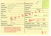 Zuname Vornamen . . .; f..; F e i n d t g~:: b . Ahrenc ixrlegsgr. Liste Nr. mar gare t ha Sterbe·Reg;'Nr. 4 • 99 Be r li n Geburtsdatum 2 2 • Standesamt Geburtsort Sarg Nr. Nationalität dt. & 7-U -T- b llrg Gest. /Gef. am ln c BO Todesursache .Le iche belgesetzt als Anschrift der Angehörigen ,, legt ftlcN den Berfimmungen des <3rCIDCrg~set:es. Es cel•~o dl• ~am:hrlf!en des Gesetzes Öber cUe Gemelndefriedh6fe •nd der L.& r ., ~l;of:ordaun; " -.i Feuer Nr. ~rk ,, e ~ ' f rablagg . Dienstgrad , ~ I Grabbrief Nr. Beruf t { L Reihe 7 Nr.l 62 Exhumiert am von Rio\1}1 nach ~- Grabzeichen: Kreuz Gräbergeset' m 1.7 lQ J Stele Platte . ul ölfentl. gepflegtes Grab ja/nein Bemerkungen: .Pried hof Stellin6en § / ~