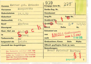 9. 3 9 Kriegsgr. Liste Nr. Kotter eeb . Kräucke Vomamen Margarethe Sterbe-Reg. Nr. Geburtsdatum Standesamt Zuname _ 3 1. 5 . 72 __c:::::._ Sa rg Nr. Geburtsort r Nr. Nationalität dt . Grabbrief Nr:.., Beruf Ehefrau Grablage: Bezirk Dienstgrad Gest. / Gef. am . in i\138a. f4! · 2 - - Exhumiert am » von burg Reihe 3o7/45 Nr.