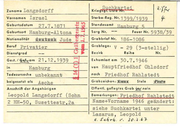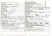 Langsdorff Vornamen Israel Gebu rtsdatum ·~ 'g 27 . 7 . 1871 ." Ö\ Geburtsort Hamburg-Al tona 41 .... " Nationalltät iRKtUk Jude if <~-4 ~ Beruf Privatier !:::! Zuname Dien 1tg rod -- 21. 12.1939 in Harnburg Todesursach e unbekannt beigeseht a ls Asche Ge st . / ~xam c - .-4 c ~ - I . s~~~k~tei . i·f fv Kn•~ lg--: --11 .... - Sterbe - Reg . Nr.1399/1 g39 f Standesamt Harnbur g 5 Sa•g Nr. Feuer Nr. 5938/39 Grobbrie f Nr. 186- 1086 -- Grobloge a - 29 (3- stellig) 8 e z irk Re i he Nr. e.humiert om 30.7 . 1946 vo., Hauptfriedhof Ohlsdorf oo ch Friedhof Rahl s t edt V Gr obze ich e., : ~:R!IRX An s chrift der Ange höri g e n OR entl. g en e gtes Grob Leopold Langsdorff (S ohn 2 HH- 50 , Susettestr . 2a Bemerkvogen : St e le R ~ ne in Friedhof Rahlstedt Name+ Vorname 1946 geändert: siehe Suchkartei unter Lazarus, Leopold $ . s c..~ y fJ . .,.. J" . j . ' "'/.