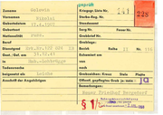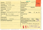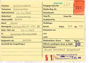 Golikow ~I - - -- Vornamen Nikolaj - - - -- Geburtsdatum 15 . 2. 19 19 -- Geb urtsort Li Si Z ino Nationalität Russe - -- Bauer Beruf Dienstgrad Stalag-Nr:3 13 12 X D - - - Gest. I Gef. am 1 .3 .194 2 -- Ham burg-Neuengamme in Zuname <- n <I eprurt ..IL t) Kriegsgr. Liste Nr. - - - - - - -- - - Sterbe-Reg. Nr. - - Standesamt Sarg Nr. - - ,., 226 Feuer Nr. - Grabbrief Nr. ... Grablage: Reihe IV Nr. - - - - - -- - Bezirk 38 1 - Exhumiert am von . nach Todesursache Le iche beigeset zt als - Grabzeichen: Kreuz Stele öffentl. gepflegtes Grab Anschrift der Angehörigen ja~ Platte ,~a Bemerkungen : . tr. , , -n ~ Neuer Fri ed-hof BergedorL "'0'"'""0""' .•. , · - an\Jrlaunl;..~.JitiL. - ~~f.f,YJ+!I<h-f6hrf+<;o - - '("}om Buod • .Wim - .. -