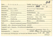 ------ Drewes :. alter Otto Bcrnhard Zuname Vornamen --- -- Geburtsdatum Geburtsort 2. 1.1 929 Kriegsgr. Liste Nr. -- - - - - - -- Sterbe-Reg. Nr. -~ Deut scher --- -- unbekannt -- I~ 16:: -- Standesamt Sarg Nr. :\~~ \'t~ Hnmburg i h3 Ü· 9 pruf " j, Feuer Nr. ~ ---- Nationalität Grabbrief Nr. Beruf Grablagi~.-Ehrenf I ie d~ O! Bezirk Reihe r. 5 - - - - --- - - - - - - Dienstgrad Gest. / Gef. am -- 27.7 . 1943 - - - - Exhumiert am Harnburg to t aufgefunde n Todesursache Bombeno:Qfer von beigesetzt als Grabzeichen: Kreuz in I1ej cbe nach ~ Stele öffentl. gepflegtes Grab ja /llA1H Anschrift der Angehörigen Bemerkungen: Plat!e I ) N.Fr.BergedotL_= - - --- -jl/r- "'~;*: -r:-' ' P. u J 1 1 -c '--- - .>J2, !IPh. 1959