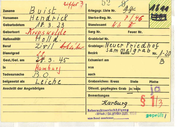 Bufa tin .!! Petr Vornamen Geburtsdatum 7. 7 . 1921 TenilCajewo Geburtsort Rus s e Nationalität Bauer Beruf Dienstgrad St alag-Nr: 3o132 X D Gest. I Gef. am 19 . 5.1 942 Hamburg- Neuenga mme in Zuname ;;:o Kriegsgr. Liste Nr. Sterbe-Reg. Nr. Standesamt .r~ , 1 H \) \. --- 109 - ---- - - Sarg Nr. Feuer Nr. Grabbrief Nr. ~ Grablage: Bezirk Reihe VI Nr. 625 Exhumiert am - von _r nach Todesursache beigesetzt als geprüft ~~- Leiche Grabzeichen: Kreuz Stele öffentl. gepflegtes Grab ja 1nit'hX Anschrift der Angehörigen - Bemerkungen: . Platte JO·c Neuer Friedhof Bergedorf ~ s .. j bh~~!ch_t~utsch•4toue I ' ~ ""~ fd. IChrlllil Bund o~erkonnt..::.l..Af.ll.. 1959 ~