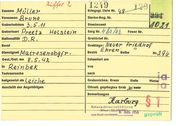 Vornamen Geburtsort Nationalität Feuer Nr. D. R . Beruf Grablage : Bezirk Gest./ Gef. am ln 2 S". f. H6~. ~3 XI )I . Exhumiert am von Todesufsache 0 b elgesetzt als Leahe Anschrift der Angehörigen nach Grabzeichen: Kreuz