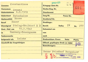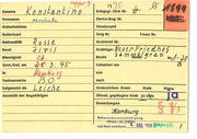 J'·'l-~1 ru( Zuname --K on 0-'Z..O-W- - - - Vornamen Fedor Geburtsdatum 1 • 1 • 19 1 5 Geburtsort Nationalität - L.:. ___ _J 403 --------; Moskow Russe I Sarg Nr. Feuer Nr. Grabbrief Nr. Dre her -- - - - - Dienstgrad St alag-Nr : 3o8 o7 X D 16 .3. 1942 Gest. 1Gef. am IIamburg- Neue ngamme Grablage: Bezirk VI Re ihe Nr. 54o Exh u miert am von nach Todesursache - Lei che beigesetzt a ls Grabzeichen: Kreuz Ste le öffentl. gepflegtes Grab ja OrtJt~ Anschrift der Angehörigen Bemerkungen: -- I Standesamt Beruf in (. • Kriegsgr. Liste N r. Sterbe-Reg. Nr. - ·' ""' ;, - ... ('! -- Pl atte Ja Neue r Fr i edho f Berged or f ~§ 1 D . ......... ,,.nhdaAdtavna ~~ . ,._lld. te~1~ om Bund ~.::'.J:.AfL 195~ -