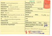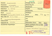 ..-----=="= prtif Zuname Kal tschunzjew _ _ ___ Vornamen Petr Gebu rtsdatum 25.9. 1919 Geburtsort Moschtschonoe Nationalität Russe Beruf Bauer Dienstgrad Stalag-Nr: 32412 X D Gest. / Gef . am 8 .6.J94:2 in Hambllrg Nen engamme Todesursache beigesetzt a ls () (' ~u Kriegsgr. Liste Nr. ---- Sterbe- Re g . Nr. ~ ,, •') J. 4 t) I' ( Cl lj _..") -~ - - -- - - -- Standesam t Sarg Nr. ... Fe u e r Nr. ~ Grabbrief Nr. Grablage : Bezi rk Reih e VII Nr. 642 Exhumie rt am von nach I,e iche Anschrift der Ang e hörigen Grabzeich e n: Kreuz Stele Platte öffe n tl. g epfl e gtes Grab ja Dl'olto Be merkungen: jO Neller Fri ed ho. L~~{!'€dorf ...., 9 ~ " e~t~chlll lgUIII lllhlildt r~ ~\. IId. ,-Bund antrkannt.• 2 APfl 19§1