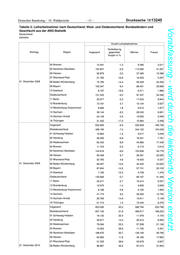 Deutscher Bundestag – 18. Wahlperiode – 11 – Drucksache 18/13245 Tabelle 2: Leiharbeitnehmer nach Deutschland, West- und Ostdeutschland, Bundesländern und Vorabfassung - wird durch die lektorierte Version ersetzt. Geschlecht aus der ANÜ-Statistik Deutschland Zeitreihe Anzahl Leiharbeitnehmer Veränderung Stichtag Region Insgesamt gegenüber Männer Frauen Vorjahr in % 04 Bremen 12.401 -1,3 9.390 3.011 05 Nordrhein-Westfalen 154.847 -5,9 113.580 41.267 06 Hessen 52.876 -3,5 37.490 15.386 07 Rheinland-Pfalz 21.760 -16,6 16.503 5.257 31. Dezember 2008 08 Baden-Württemberg 75.780 -14,4 50.328 25.452 09 Bayern 102.347 -9,4 68.451 33.896 10 Saarland 8.197 -19,6 6.311 1.886 Ostdeutschland 131.543 -6,3 97.337 34.206 11 Berlin 25.977 -2,3 17.033 8.944 12 Brandenburg 13.161 5,7 10.134 3.027 13 Mecklenburg-Vorpommern 8.690 1,8 6.813 1.877 14 Sachsen 38.144 -8,3 28.343 9.801 15 Sachsen-Anhalt 24.149 -4,5 19.050 5.099 16 Thüringen 21.422 -17,4 15.964 5.458 Insgesamt 632.565 -6,0 435.839 196.726 Westdeutschland 498.190 -7,4 344.152 154.038 01 Schleswig-Holstein 12.863 -1,3 9.617 3.246 02 Hamburg 26.092 -6,8 18.331 7.761 03 Niedersachsen 62.433 -8,8 44.985 17.448 04 Bremen 11.724 -5,5 8.712 3.012 05 Nordrhein-Westfalen 144.616 -6,6 103.838 40.778 06 Hessen 56.406 6,7 36.351 20.055 07 Rheinland-Pfalz 22.760 4,6 16.423 6.337 31. Dezember 2009 08 Baden-Württemberg 66.267 -12,6 42.445 23.822 09 Bayern 87.844 -14,2 57.741 30.103 10 Saarland 7.185 -12,3 5.709 1.476 Ostdeutschland 130.680 -0,7 89.187 41.493 11 Berlin 25.271 -2,7 16.014 9.257 12 Brandenburg 12.975 -1,4 9.906 3.069 13 Mecklenburg-Vorpommern 8.186 -5,8 6.192 1.994 14 Sachsen 41.774 9,5 26.020 15.754 15 Sachsen-Anhalt 20.760 -14,0 15.611 5.149 16 Thüringen 21.714 1,4 15.444 6.270 Insgesamt 823.590 30,2 589.794 233.796 Westdeutschland 657.120 31,9 468.917 188.203 01 Schleswig-Holstein 16.133 25,4 11.979 4.154 02 Hamburg 29.817 14,3 20.912 8.905 03 Niedersachsen 78.384 25,5 57.258 21.126 04 Bremen 15.003 28,0 11.702 3.301 05 Nordrhein-Westfalen 188.975 30,7 139.195 49.780 06 Hessen 62.962 11,6 45.160 17.802 07 Rheinland-Pfalz 31.535 38,6 22.878 8.657 31. Dezember 2010 08 Baden-Württemberg 98.867 49,2 67.013 31.854