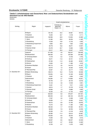 03 Niedersachsen 91.985 65.397 26.588 16.778 64.316 9.679 1.212 2,8 3,8 1,6 3,9 2,9 1,7 1,0 04 Bremen 16.435 12.136 4.299 2.551 11.866 1.820 198 4,5 6,2 2,5 5,8 4,8 2,9 1,8 05 Nordrhein-Westfalen 220.013 154.553 65.460 37.723 154.864 24.960 2.465 2,8 3,8 1,7 3,9 3,0 1,9 1,0 06 Hessen 70.582 49.599 20.983 10.083 51.765 7.943 791 2,5 3,4 1,5 3,1 2,7 1,7 0,9 07 Rheinland-Pfalz 39.250 27.727 11.523 7.470 26.907 4.359 514 2,4 3,4 1,4 3,4 2,6 1,5 0,8 31. Dezember 2015 08 Baden-Württemberg 119.871 79.556 40.315 21.018 83.852 13.613 1.388 2,3 3,0 1,6 3,1 2,5 1,6 0,8 09 Bayern 146.270 97.007 49.263 24.630 105.618 14.542 1.480 2,4 3,1 1,7 3,0 2,6 1,5 0,7 10 Saarland 11.851 8.766 3.085 2.026 8.197 1.485 143 2,6 3,8 1,4 3,8 2,8 1,7 0,9 Ostdeutschland 181.301 128.473 52.828 21.142 130.272 27.956 1.931 2,8 4,0 1,6 4,0 2,9 2,2 1,1 11 Berlin 37.424 23.635 13.789 6.128 26.377 4.422 497 2,5 3,3 1,8 4,4 2,4 1,9 1,4 12 Brandenburg 20.373 14.474 5.899 2.427 14.713 2.994 239 2,3 3,2 1,3 3,5 2,4 1,5 1,0 13 Mecklenburg-Vorpommern 11.195 8.367 2.828 955 8.129 1.987 124 1,8 2,8 0,9 1,9 2,0 1,5 0,8 14 Sachsen 54.490 39.947 14.543 5.810 39.800 8.392 488 3,2 4,7 1,7 4,2 3,4 2,4 1,0 15 Sachsen-Anhalt 24.935 18.569 6.366 2.365 17.911 4.408 251 2,9 4,4 1,5 3,5 3,1 2,3 1,1 16 Thüringen 32.884 23.481 9.403 3.457 23.342 5.753 332 3,8 5,3 2,2 5,0 4,0 3,0 1,3 Insgesamt 992.756 693.102 299.654 160.720 700.502 119.806 11.728 2,7 3,7 1,7 3,7 2,9 1,8 0,9 Westdeutschland Deutscher Bundestag – 18. Wahlperiode 804.698 560.144 244.554 137.485 567.348 90.248 9.617 2,7 3,6 1,7 3,6 2,8 1,7 0,9 01 Schleswig-Holstein 22.092 15.400 6.692 3.820 15.051 2.907 314 2,0 2,7 1,2 2,6 2,0 1,5 0,7 02 Hamburg 32.542 22.545 9.997 4.925 24.047 3.190 380 3,1 4,1 2,0 4,2 3,2 2,0 1,3 03 Niedersachsen 95.366 67.691 27.675 17.693 65.989 10.337 1.347 2,8 3,9 1,7 4,0 3,0 1,7 1,1 04 Bremen 17.583 13.034 4.549 2.810 12.616 1.915 242 4,7 6,5 2,7 6,3 5,1 2,9 2,1 05 Nordrhein-Westfalen 234.048 166.358 67.690 40.953 163.056 27.340 2.699 3,0 4,1 1,8 4,2 3,1 1,9 1,0 06 Hessen 73.645 52.214 21.431 10.721 53.690 8.387 847 2,6 3,5 1,6 3,2 2,7 1,7 0,9 07 Rheinland-Pfalz 40.871 29.186 11.685 7.505 28.126 4.658 582 2,5 3,5 1,4 3,4 2,7 1,5 0,9 31. Dezember 2016 08 Baden-Württemberg 124.491 82.610 41.881 21.991 86.555 14.535 1.410 2,4 3,0 1,7 3,2 2,5 1,6 0,7 09 Bayern 152.786 102.828 49.958 25.165 110.498 15.471 1.652 2,5 3,2 1,7 3,1 2,7 1,5 0,8 – 15 – 10 Saarland 11.274 8.278 2.996 1.902 7.720 1.508 144 2,5 3,5 1,4 3,6 2,6 1,7 0,9 Ostdeutschland 188.050 132.952 55.098 23.234 133.150 29.556 2.110 2,9 4,1 1,7 4,2 3,0 2,2 1,1 11 Berlin 39.825 25.057 14.768 6.901 27.493 4.863 568 2,6 3,3 1,9 4,7 2,5 1,9 1,4 12 Brandenburg 22.174 15.954 6.220 2.737 15.787 3.384 266 2,4 3,4 1,4 3,9 2,6 1,7 1,0 13 Mecklenburg-Vorpommern 10.930 8.220 2.710 1.048 7.759 2.016 107 1,8 2,7 0,8 2,0 1,9 1,4 0,6 14 Sachsen 54.479 39.719 14.760 5.805 39.604 8.545 525 3,1 4,5 1,7 4,1 3,4 2,4 1,0 15 Sachsen-Anhalt 26.194 19.418 6.776 2.767 18.448 4.673 306 3,0 4,5 1,6 4,0 3,2 2,4 1,2 16 Thüringen 34.448 24.584 9.864 3.976 24.059 6.075 338 3,9 5,5 2,3 5,6 4,1 3,1 1,2 Quelle: Statistik der Bundesagentur für Arbeit Drucksache 18/13245 Vorabfassung - wird durch die lektorierte Version ersetzt.