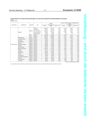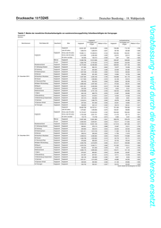 Deutscher Bundestag – 18. Wahlperiode – 19 – Drucksache 18/13245 Vorabfassung - wird durch die lektorierte Version ersetzt. Tabelle 6: Median der monatlichen Bruttoarbeitsentgelte von sozialversicherungspflichtig Vollzeitbeschäftigten der Kerngruppe Deutschland Zeitreihe Insgesamt darunter: Leiharbeitnehmer (WZ 2008, 782+783) mit Angabe zum mit Angabe zum Berichtsmonat Polit Gebiet AO Geschlecht Alter Insgesamt Median in Euro Insgesamt Median in Euro Entgelt Entgelt 04 Bremen Insgesamt Insgesamt 208.312 206.343 3.334 10.906 10.750 1.872 31. Dezember 2016 05 Nordrhein-Westfalen Insgesamt Insgesamt 4.392.612 4.350.264 3.234 159.426 156.081 1.761 06 Hessen Insgesamt Insgesamt 1.646.798 1.630.665 3.418 48.132 47.224 1.873 07 Rheinland-Pfalz Insgesamt Insgesamt 876.848 869.205 3.113 27.996 27.510 1.730 08 Baden-Württemberg Insgesamt Insgesamt 3.045.755 3.019.979 3.465 92.029 90.603 1.776 09 Bayern Insgesamt Insgesamt 3.576.724 3.546.711 3.266 111.636 109.999 1.902 10 Saarland Insgesamt Insgesamt 253.354 251.059 3.248 8.691 8.440 1.686 Ostdeutschland Insgesamt Insgesamt 3.838.170 3.805.262 2.510 137.960 135.738 1.615 11 Berlin Insgesamt Insgesamt 874.247 864.601 3.024 21.722 21.363 1.791 12 Brandenburg Insgesamt Insgesamt 531.657 527.051 2.416 14.646 14.187 1.580 13 Mecklenburg-Vorpommern Insgesamt Insgesamt 360.190 356.808 2.306 8.591 8.430 1.582 14 Sachsen Insgesamt Insgesamt 1.021.811 1.014.409 2.388 43.416 42.824 1.646 15 Sachsen-Anhalt Insgesamt Insgesamt 509.525 505.992 2.408 20.035 19.798 1.573 16 Thüringen Insgesamt Insgesamt 540.740 536.401 2.367 29.550 29.136 1.548 Quelle: Statistik der Bundesagentur für Arbeit X) Aus methodischen Gründen ist ein Ausweis von Entgeltverteilungen oder Quantilen nicht sinnvoll, wenn die Zahl der Beschäftigten mit Angabe zum Entgelt unter 1.000 liegt.