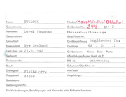 Name BURKE Friedhof Hauo L/,.i~ ~ h ..., f 2 § 1I Geburtsname Vornomen J John Ehrenanlage/Streulage Geburtsdatum Sarg/Feuer Nr. Geburtsort Grabbezeichnung Nationalität Gest./Gef. am Engländer 7, 5 , 1945 Groblage Grabzeichen: Englischer Fr . 3A D Kreuz - Stele - Platte Sterbeort öffentlich gepflegtes Grob ab P Todesursache RRE ob Beruf Exhumiert/Oberführt am Di enstgrad Truppenteil Ohlsdorf Tpr , 3780853 jährl./Abfindung von/noch Angehörige: Standesamt Sterberegister Nr. Für Veränderungen, Berichtigungen und Vermerke bitte Rückseite benutzen. 3