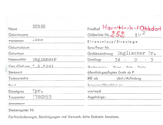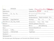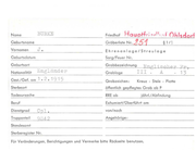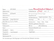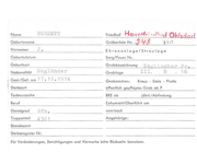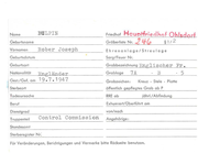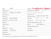 Name BULPIN Geburtsname Vornamen Friedhof Hauetfriedhof Obisdorf Gräberliste Nr. --.. Rober Joseph Sarg/Feuer Nr. Geburtsort Grabbezeichnung IGest./Gef. am Engländer Grablage 19 • 7 • 194 7 Grabzeichen: Kreuz - Stele - Platte öffentlich gepflegtes Grab ab P Todesursache RRE ab Beruf Exhumiert/Oberführt am Dienstgrad von/nach Control Commission 2 Englischer Fr. 7A - B - 5 Sterbeort Truppenteil § 1I Ehrenanlage/Streulage Geburtsdatum Nationalität Y.t.· jährl./ Abfindung Angehörige: ~~~~~------------------------- Standesamt Sterberegister Nr: Für Veränderungen, Berichtigungen und Vermerke bitte Rückseite benutzen.