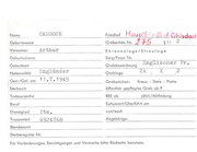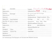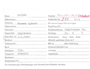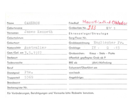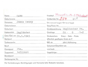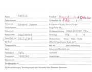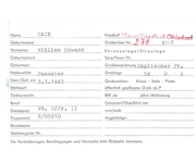 Name CAIN Geburtsname Vornamen Wi lliam Edward Ehrenanlage/Streulage Geburtsdatum Sorg/Feuer Nr. Geburtsort Grabbezeichnung Englischer Nationalität Canadi er Grabloge Gest./Gef. am 3 • 3 • 194 3 Grabzeichen : I 5A· öffentlich gepflegtes Grab ab P Todesursache RRE ab Beruf Exhumiert/Oberführt am Dienstgrad von/nach Truppenteil R/85910 Angehörige: D Kreuz - Stele - Platte Sterbeort Wt . Offr . II Fr . jährl./Abfindung Standesamt Sterberegister Nr. Für Veränderungen, Berichtigungen und Vermerke bitte Rückseite benutzen. 4
