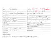 CALDWELL Name Hrw!"\~f .. i -,.!(, .... f Gräberliste Nr. ... Geburtsname John Cruj cksbank Vornamen Friedhof ,~ 1 Ob isdorf § 1I Ehrenan l age/Streulage Geburtsdatu m Sarg/Fe uer Nr. G e burtsort Grabbezeichnung En g lischer Nationalitä t 1 Gest./Ge f. am F Grablage 1OA - 1 , 9, 1940 Grabzeichen: Kreuz - Stele - Platte öffe ntlich gepflegtes Grab ab P Todesursache RRE ab Beruf Exhumiert/Oberführt am Truppenteil Fr . Engl ä nd..e.:: . r=------ :: --- Sterbeort Dienstgrad 2 Ldg , Cook (S) P/MX 508 74 jährl./Abfindung von/nach Angehörige : Standesamt Sterberegister Nr. Für Veränderung e n, Berichtigungen und Vermerke bitte Rü ckseite benutze n. 7