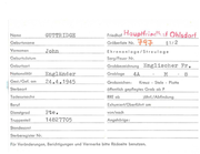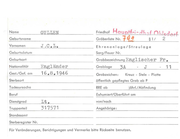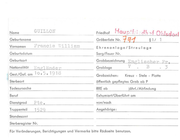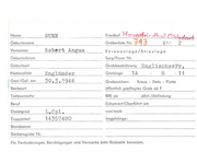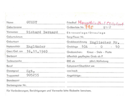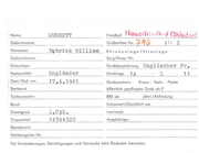 Name GULLEN Geburtsname Vornamen Friedhof Hauptf,.; ... ,.tb.-..f nt.,l'id orf Gräb erliste J.C . L. Nr. f q., 2 § 1I Ehrenanlage/Streulage Geburtsdatum Sarg/Feuer Nr. Geburtsort Grabbezeichnung Englischer Nationalität Engländer Grablage I Gest./Gef. am 16 . 8 . 1946 Grabzeichen: 3A J Kreuz • Stele • Platte Sterbeart öffentlich gepflegtes Grob ab P Tadesursache RRE ab Beruf Exhumiert/Oberführt am Dienstgrad Lt. von/nach Truppenteil 317571 Angehörige: Fr . jährl./Abfindung Standesamt Sterberegister N r. Für Veränderungen, Berichtigungen und Vermerke bitte Rockseite benutzen. 11