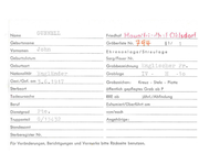 Name GUEST Geburtsname Vornamen Richard Bernard HoYftfri o dh . ! 01· Ir: ...;,..,: f q(' §lI 2 Friedhof Gröberliste Nr. • Ehrenanlage/Streulage Geburtsdatum Sarg/Feuer Nr. Geburtsort Grabbezeichnung Nationalität IGest./Gef. am Engländer Grablage 16 , 11 , 1940 Grabzeichen: Englischer Fr • 1 OA 0 Kreuz - Stele - Platte Sterbeort öffentlich gepflegtes Grab ab P Todesursache RRE ab Beruf Exhumiert/Oberführt am Dienstgrad Truppenteil Sgt . 905255 jährl./ Abfindung von/nach Angehörige: Standesamt Sterberegister Nr. Für Veränderungen, Berichtigungen und Vermerke bitte Rockseite benutzen. 10