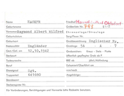 Name HACKER --------------~ Friedhot Honnff .. i , ,.Jt, .... q~ f Ohf sr.~ or f § 1I Geburtsname Gräberliste Nr. 1 VornamenRaymond Albert Wilfred Ehren an I a geIStreu I a g e Geburtsda tum Sa rg/Feu er Nr. ~~~~--------------------------- Geburtsort Nationalität IGest./Gef. am 2 Grabbezeichnung Engländer Grablage 12.10 . 1942 Grabzeichen: E nglischer 5A A Kreuz - Stele - Platte Sterbeort öffentlich gepflegtes Grab ab P Todesursache RRE ab Beruf Exhumiert/Oberführt am Dienstgrad S gt . von/nach Truppenteil 641680 Angehörige: jährl./Abfindung Standesamt Sterberegister Nr. Für Veränderungen, Berichtigungen und Vermerke bitte Rockseite benutzen. Fr • 7