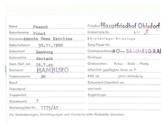 Name Pa~a~s~c~hL__________________ FriedhofRauptfriedhof Ohfsclorf Geburtsname Pnna t Gräberliste Nr. VornamenAmanda Emma 30.11.1900 Geburtsdatum Geburtsort Karoline Harnburg _N_a_ti_o_na _ l_it_ä_t ____.. ,d eu t s eh § 1I Ehrenanlage /Streulage Sarg/ Feuer Nr. Grabbezeichnun~ O- SA.vlME LG RAJ Grablage ·- ------- Gest./Gef. am 26.7 .~ Grabzeichen: Sterbeort BAMBUR_G"'-'- -1_ _ öffentlich gepflegtes Grab ab P BO Todesursache RRE ab Kreuz - Stele - Platte jährl.l Abfindung Beruf Exhumiert / überführt am Dienstgrad von / nach Truppentei_l _ _ Angehörige: --------------------- Standesamt Sterberegister Nr. '7 ,z 7 1775/43 Für Veränderungen, Berichtig unge n und Vermerke bitte Rückseite benutzen.