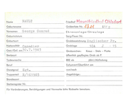 Name NAULT Geburtsname Vornamen Friedhof Hountf:-i .:: dh:>f Ch isdorf Gräberliste Nr. George Gonrad AJJ4 Ehrenanlage/Streulage Geburtsdatum Sarg/ Feuer Nr. Geburtsort Grabbezeichnung Nationalität Ca n a d j er IGest./Gef. am 30 • 7 • 1943 Grablage Grabzeichen : Engl i sehe r Fr . 1 0A öffentlich gepflegtes Grob ob P Todesursa che RRE ob Beruf Exhumiert/Oberführt om S gt • Truppenteil R/1 6 19 8 3 J Kreuz - Stele - Platte Sterbeort Dienstgrad § 1I 2 jährl./Abfindung von/noch Angehörige: Standesamt Sterberegister Nr. Für Veränderungen, Berichtigungen und Vermerke bitte Rockseite benutzen. 15