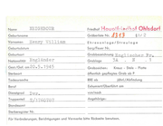 Name NEW Friedhof Geburtsname Vornamen Haupllii2dh.Jf OhJsdorf Gräberliste Nr. H. c. ,.f 1 Jl Sarg/Feuer Nr. Geburtsort Grabbezeichnung Fn gl Gest.!Gef. am Engländ e r 4. 8 .1 9 17 Grablage Grabzeichen: ; c-, cb e r l!' r , IIL öffentlich gepflegtes Grob ab P Todesursache RRE ab Beruf Exhumiert/Oberführt am 2nd Std Truppenteil l1~ercantile jährl./Abfindung von/nach l\Iarine E - Kreuz - Stele - Platte Sterbeort Dienstgrad ...:... 1 _ __ Ehrenanlage/Streulage Geburtsdatum Nationalität § 1I Angehörige: Standesamt Sterberegister Nr. Für Veränderungen, Berichtigungen und Vermerke bitte Rückseite benutzen. 14
