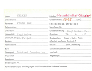 Name Hat•otfri .~ dhof Chisdorf § 112 Gräberliste Nr. ;Jj 4S NELKEN Friedhof Geburtsname Vornamen :B'rank Max Ehrenanlage/Streulage Geburtsdatum Sarg / Feuer N r. G e burtsort Grabbezeichnung Nationalität Eng] änd e r I Gest./Gef. am 28 • 7 . 1946 Grablage Grabz eichen: }1;ngl j 7A - s cb er Fr . A Kreuz - Stele - Platte Sterbeort öffentlich gepflegtes Grab ab P Todesursache RRE ab Beruf Exhumiert/Oberführt am Dienstgrad Control Truppentei I Co~~ission - 2 jährl./ Abfindung von/nach ----------------------------- Angehörige: Standesamt Sterberegister Nr. Für Veränderungen, Berichtigungen und Vermerke bitte Rockseite benutzen.