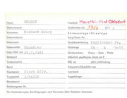 Name NELS ON Geburtsname Vornomen Friedhof H a uotfr ir dh of Gräberliste Nr. Ri chard Keary 1~.! {: Ohlsdorf § 1/ 2 Ehrenanlage/Streuloge Geburtsdatum Sorg/Feuer Nr. Geburtsort Grobbezeichnung Englis c her Fr . 5A - Nationalität Canadie r Grobloge Gest./Gef. om 29 . 7 .1 944 Grobzeichen: A Kreuz - Stele - Plotte Sterbeort öffentlich gepflegtes Grob ob P Todesursoche RRE ob Beruf Exhumiert/Oberführt om Dienstgrad Pilot Offr . von/noch Truppenteil J/94226 Angehörige: - 9-1 1 jährl./Abfindung Standesamt Sterberegister Nr. Für Veränderungen, Berichtigungen und Vermerke bitte Rockseite benutzen.