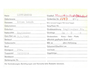 Name LITTLEMOHE Geburtsname Vornamen Friedhof Haup tfrirrlbof Obisdorf Gräberliste Nr. Brian Leach J {)t} 'J- § 1I 2 Ehrenanlage/Streulage Geburtsdatum Sarg/Feuer Nr. Geburtsort Grabbezeichnung Nationalität Engländer Grablage Gest./Gef. am 3 . 5 . 1945 Grabzeichen: ..:;nglischer I!'r . 2A D Kreuz • Stele · Platte Sterbeort öffentlich gepflegtes Grob ab P Todesursache RRE ab Beruf Exhumiert/Oberführt am Dienstgrad Pte . von/nach Truppenteil 14551514 Angehörige: . 8 jöhrl./Abfindung Standesamt Sterberegister Nr. Für Veränderungen, Berichtigungen und Vermerke bitte Rückseite benutzen.