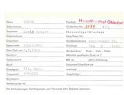 Name LLOYD Geburtsname Vornomen J. Hauptfriedhof Obisdorf Gröberliste Nr.1JD1 §1/ 1 Friedhof Ehrenanlage/Streuloge Geburtsdatum Sorg/Feuer Nr. Geburtsort Grabbezeichnung ~ n gl Nationalität Engländer Grobloge Gest./Gef. am 14 • 5 • 19 18 Grobzeichen: i s cl::e r .2 r . VI - A - 7 Kreuz - Stele - Plotte Sterbeort öffentlich gepflegtes Grob ob P Todesursoche RRE ob Beruf Exhumiert/Oberführt om Dienstgrad Truppenteil Pte . 3o7332 jährl./ Abfindung von/noch Angehörige: Standesamt Sterberegister Nr. Für Veränderungen, Berichtigungen und Vermerke bitte Rückseite benutzen.