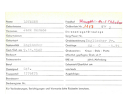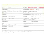 Name LONG Geburtsname Vornamen \l . Hauptfriedhof Ohlsdorf Gräberliste Nr. J1 "ftf Friedhof Ehrenanlage/Streulage Geburtsdatum Sarg/Feuer Nr. Geburtsort Grabbezeichnung Nationalität En g l änd e r,________ Grablage Gest./Gef. am 3. 9 . 1 q 1 7 . Grabzeichen: ISterbeort Englis che r F r. -c III Kreuz - Stele - Platte öffentlich gepflegtes Grab ab P Todesursache RRE ab Beruf Exhumiert/Oberführt am Dienstgrad Pte . von/nach Truppenteil 2o 196 4 Angehörige: 4- jährl./Abfindung Standesamt Sterberegister Nr. Für Veränderungen , Berichtigungen und Vermerke bitte Rockseite benutze n.