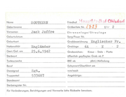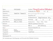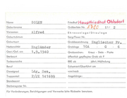 Name SOLEN Geburtsname Vornomen Friedhof Hauptfriedhof Ohlsdorf A}, (, 2 Gröberliste Nr. Alfred § 1I Ehrenanlage/Streuloge Geburtsdatum Sarg/Feuer Nr. Geburtsort Grabbezeichnung Englischer Fr . 1 OA Nationalität Engländer Grablage Gest./Gef. am 1 . 9 . 1940 Grabzeichen: G Kreuz - Stele - Platte Sterbeort öffentlich gepflegtes Grob ab P Todesursache RRE ab Beruf Exhumiert/Oberführt am Dienstgrad Ldg . Sea . von/noch Truppenteil P/JX 141699 Angehörige: jährl./Aqfindung Standesamt Sterberegister Nr. Für Veränderungen, Berichtigungen und Vermerke bitte Rockseite benutzen. 6