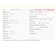 Name SOivliilERVILLE Geburtsname Vornomen Friedhof Hauptfriedhof Ohlsdorf Gröberliste Nr. / J ohn 'f11 § 1I 1 Ehrenanlage/Streulage Geburtsdatum Sarg/Feuer Nr. Geburtsort Grabbezeichnung Nationalität Canadier Groblage Gest./Gef. am 4 • 11 • 1 9 1 8 Grabzeichen: Eng] i s cb er F r . IV . E . 10 Kreuz - Stele - Platte Sterbeort öffentlich gepflegtes Grab ab P Todesursache RRE ab Beruf Exhumiert/Oberführt am Dienstgrad Pte . von/nach Truppenteil 1728 1 Angehörige: jährl./Abfindung Standesamt Sterberegister Nr. Für Veränderungen, Berichtig ungen und Vermerke bitte Rockseite benutzen.