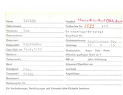 Name TAYLOR Geburtsname Vornamen Friedhof Hauptfriedhof Ohlsdorf Gröberliste Nr. ) :, illiam ~ .! ) §l I 1 Ehrenanlage/Streulage Geburtsdatum Sarg/Feuer Nr. Geburtsort Grabbezeichnung Englis c her III. Nationalität Engländer Grablage Gest./Gef. am 5 • 11 • 1 9 18 Grabzeichen : Kreuz - Stele - Platte Sterbeort öffentlich gepflegtes Grob ab P Todesursa che RRE ab Beruf Exhumiert/Oberführt am Die nstgrad Truppenteil Pte . 5;219 H . jöhrl./Abfindung von/nach Angehörige: Standesamt Sterberegister Nr. Für Veränderungen, Berichtigungen und Vermerke bitte Rockseite benutze n. 16