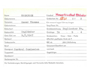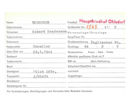 Name THOMPSONf Geburtsname Vornamen Friedhof Ho uptTrii?.dhof OhJsJ ... r{ Gräberliste Nr. Robert Ag lf.l Sarg/Feuer Nr. Geburtsort Grabbezeichnung IGest./Gef. am Engländer 22.6.1945 Grablage Grabzeichen: Englischer 2A A Kreuz - Stele - Platte Sterbeort öffentlich gepflegtes Grab ab P Todesursache RRE ab Beruf Exhumiert/Oberführt am Dienstgrad Truppenteil Sjt . 13086642 2 Ehrenanlage/Streulage Geburtsdatum Nationalität §lI jährl./ Abfindung von/nach Angehörige: Standesamt Sterberegister Nr. Für Veränderungen, Berichtigungen und Vermerke bitte Rockseite benutzen. Fr. 6