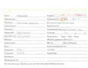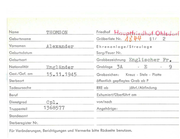 Name THOMSON Geburtsname Vornamen Friedhof Gräberliste Nr . Wj J lj am Geekie .Jj 9-h Sarg/Feuer Nr. Geburtsort Grabbezeichnung E ngl i Gest./Gef. am :Cngl i:ind er 1 3 , 5 . 1 9 10 1 Ehrenanlage/Streulage Geburtsdatum Nationalität § 1/ Grablage Grabzeichen: I I· sehe r F'r. C 3 Kreuz - Stele - Platte Sterbeort öffentlich gepflegtes Grab ab P Todesursoche RRE ab Beruf Exhumiert/Oberführt am Die nstgrad Pte . von/nach Truppenteil 51576 Angehörige: jährl./ Abfindung --------------------------------- Standesamt Sterberegister Nr. Für Veränderungen, Berichtigungen und Vermerke bitte Rockseite benutzen.