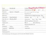 Name WEBB Geburtsname Vornamen George Friedhof Hauptfriedhof Ohlsdorf Gräberliste Nr. Francis Herbert ) Ehren an I a g e I Geburtsdatum Sarg/Feuer Nr. Geburtsort Grabbezeichnung Nationalität Engländer Grablage Gest./Gef. am 2 .5.1 945 Grabzeichen : r, [.-/. Englischer Fr , 6A A 15 Kreuz - Stele - Platte öffentlich gepflegtes Grab ab P Todesursache RRE ab Beruf Exhumiert/Oberführt am Wing Cdr . von/nach Truppenteil 90987 Angehörige: 2 s Ire u I a g e Sterbeort Dienstgrad § 1I jährl./ Abfindung Standesamt Sterberegister Nr. Für Veränderungen, Berichtigungen und Vermerke bitte Rückseite benutzen.