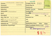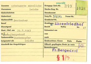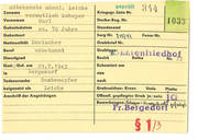 unbekannte männl . Leiche Zuname V--@-mRU-t 1 i-e-h {) eh ep er--- Vornamen Carl Geburtsdatum ca . 7_Q Jahre Geburtsort Nationalität Beruf - Deutscher unbekannt - - - --- -- ge rtA 3 ~ {~ Kriegsgr. Liste Nr. - - - - - - -- - Sterbe-Reg. Nr. -- - -- Standesamt Sarg Nr. '}.~ "\"!, Feuer Nr. - Grabbrief Nr. e n f 1 ie dho~ Die nstgrad Grabl38 ,=- L.hl Bezirk Reihe Gest. I Gef. am Exhum iert am 29.7 . 1942 Nr. Bergedorf Bombenopfer Todesursache beigesetzt a ls Le i che Grabzeich en: Kreuz Anschrift der Angehörigen öffentl. gepflegtes Grab . ja / nein in - - - l03 a 3 von nach Stele Platte J()j Bemerkuf'r: B~'tg~lf8 ff ~~- § 1/2