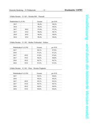 Deutscher Bundestag – 19. Wahlperiode – 21 – Drucksache 19/4761 Vorabfassung - wird durch die lektorierte Version ersetzt. S-Bahn Dresden – S 3 SO – Dresden Hbf – Tharandt Pünktlichkeit % (5:59) Gesamt per JUN 2017 98,4% 98,2% 2018 99,2% 99,2% 2017 HVZ 97,8% 97,5% 2017 NVZ 98,8% 98,7% 2018 HVZ 98,9% 98,9% 2018 NVZ 99,4% 99,4% S-Bahn Dresden – S 1 SO – Meißen Triebischtal – Schöna Pünktlichkeit % (5:59) Gesamt per JUN 2017 98,1% 97,9% 2018 97,2% 97,2% 2017 HVZ 97,8% 97,6% 2017 NVZ 98,2% 98,0% 2018 HVZ 96,7% 96,7% 2018 NVZ 97,5% 97,5% S-Bahn Dresden – S 2 SO – Pirna – Dresden Flughafen Pünktlichkeit % (5:59) Gesamt per JUN 2017 99,5% 99,6% 2018 99,2% 99,2% 2017 HVZ 99,1% 99,3% 2017 NVZ 99,7% 99,7% 2018 HVZ 98,9% 98,9% 2018 NVZ 99,4% 99,4%