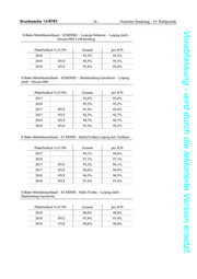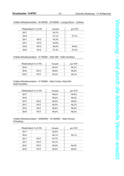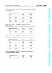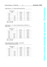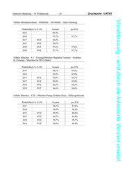 Drucksache 19/4761 – 28 – Deutscher Bundestag – 19. Wahlperiode Vorabfassung - wird durch die lektorierte Version ersetzt. S-Bahn Mitteldeutschland – S6 MDSB – S6 MDSB – Leipzig-Messe – Geithain Pünktlichkeit % (5:59) Gesamt per JUN 2017 94,1% 2018 97,1% 97,1% 2017 HVZ 94,5% 2017 NVZ 94,0% 2018 HVZ 96,8% 96,8% 2018 NVZ 97,2% 97,2% S-Bahn Mitteldeutschland – S7 MDSB – Halle Hbf – Halle-Nietleben Pünktlichkeit % (5:59) Gesamt per JUN 2018 98,2% 98,2% 2018 HVZ 98,0% 98,0% 2018 NVZ 98,3% 98,3% S-Bahn Mitteldeutschland – S7 MDSB – Halle-Trotha- Halle Hbf- Halle-Nietleben Pünktlichkeit % (5:59) Gesamt per JUN 2017 98,6% 98,4% 2018 98,6% 98,6% 2017 HVZ 98,9% 98,8% 2017 NVZ 98,5% 98,2% 2018 HVZ 98,6% 98,6% 2018 NVZ 98,6% 98,6% S-Bahn Mitteldeutschland – S8MDSB2 – S8 MDSB2 – Halle-Dessau/ Wittenberg Pünktlichkeit % (5:59) Gesamt per JUN 2017 96,4% 2018 96,1% 96,1% 2017 HVZ 95,7% 2017 NVZ 96,7% 2018 HVZ 96,4% 96,4% 2018 NVZ 96,0% 96,0%
